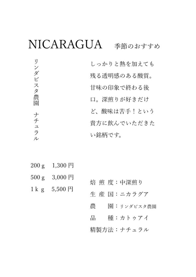 25 ニカラグア リングビスタ農園 ナチュラル 中深煎り 500g